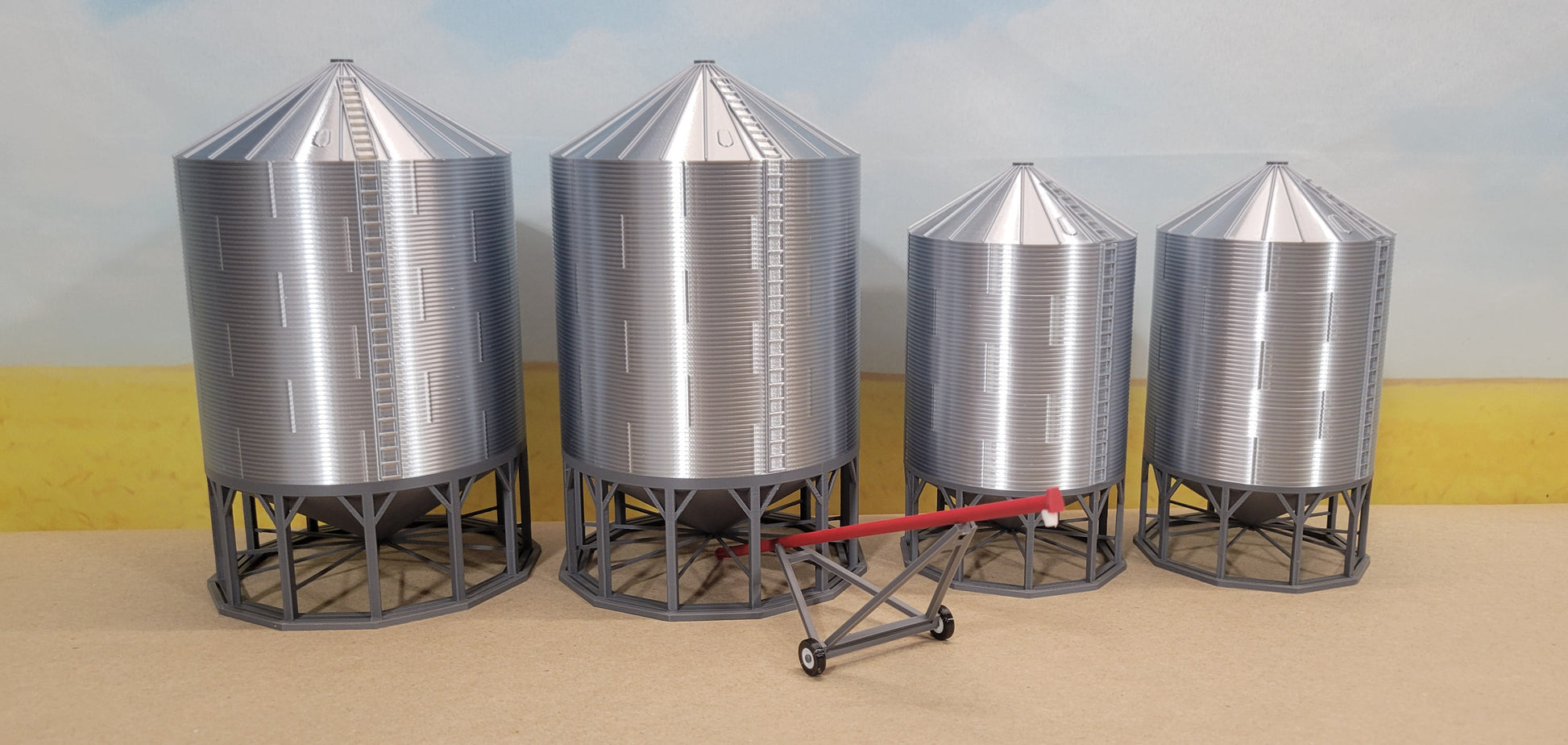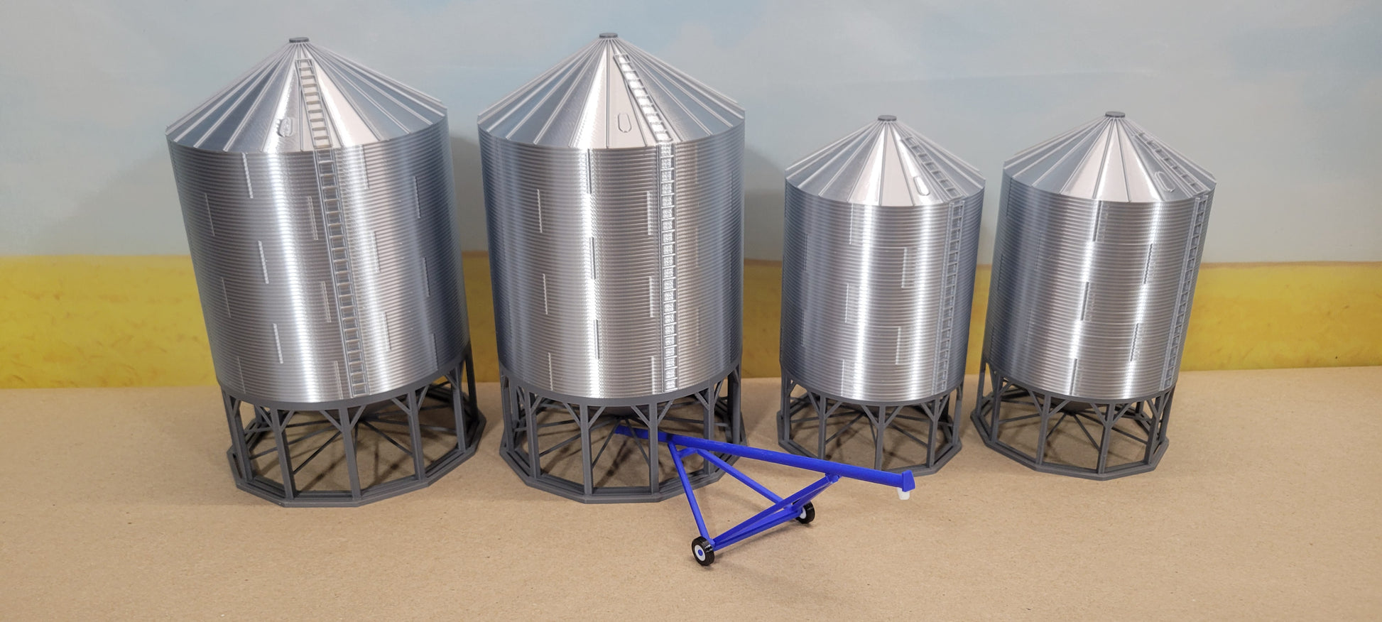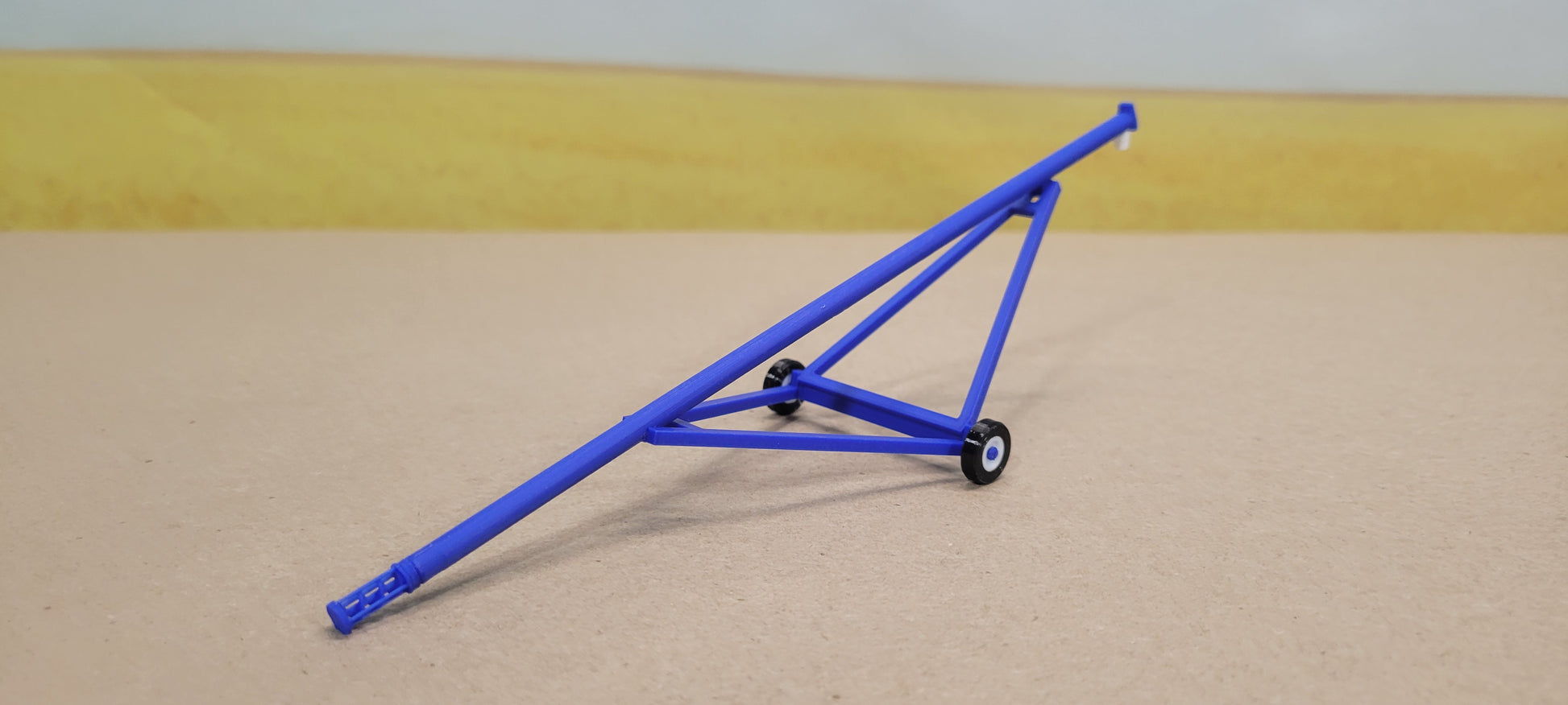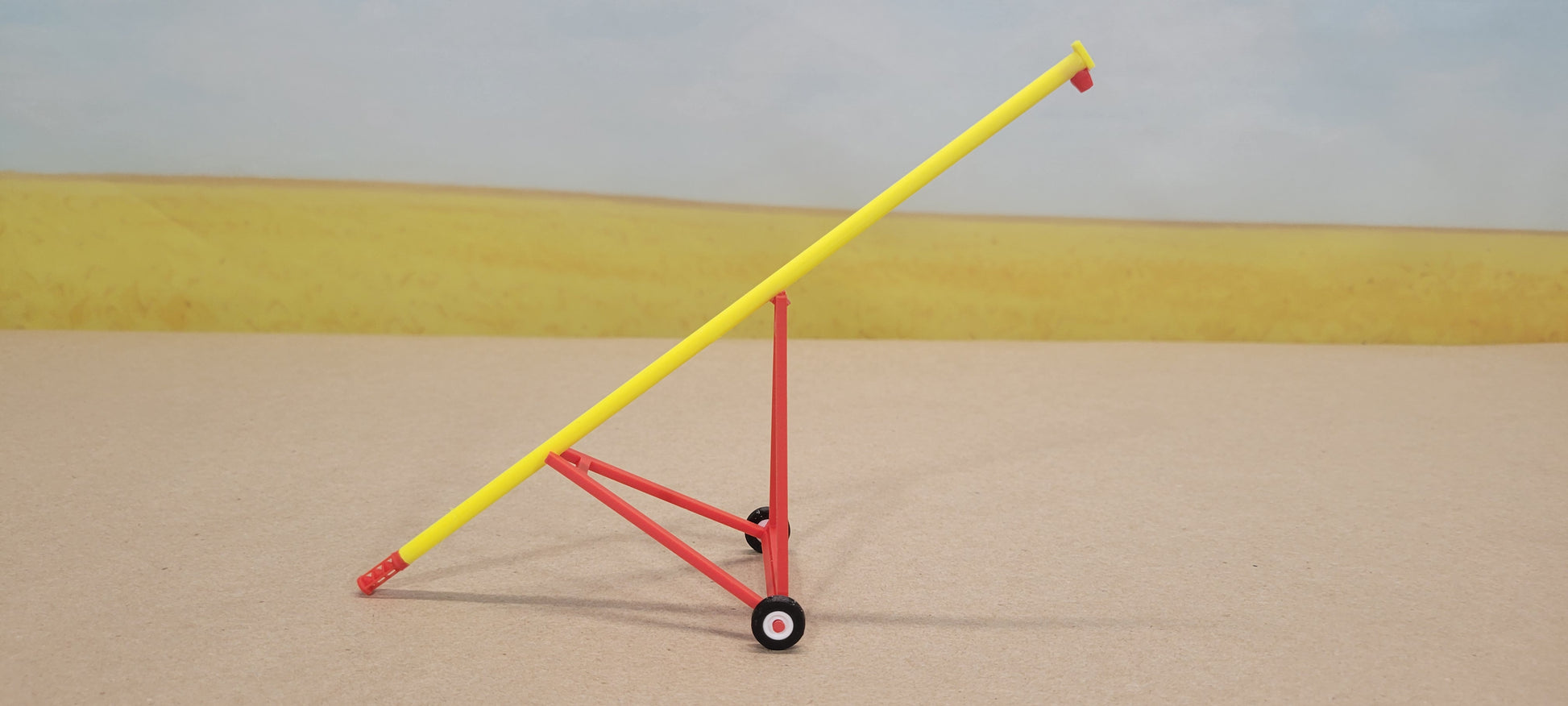 A 1:64 replica of a 10x40 (10" diameter tube with 40' length) truck loadout auger used to empty the grain bins. Auger lifts up and down (and stays at whatever position you select). These augers are 100% manufactured, assembled and tested by myself.